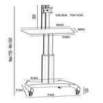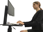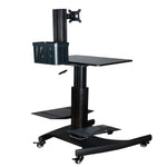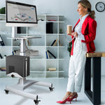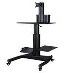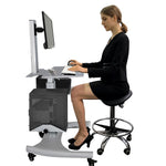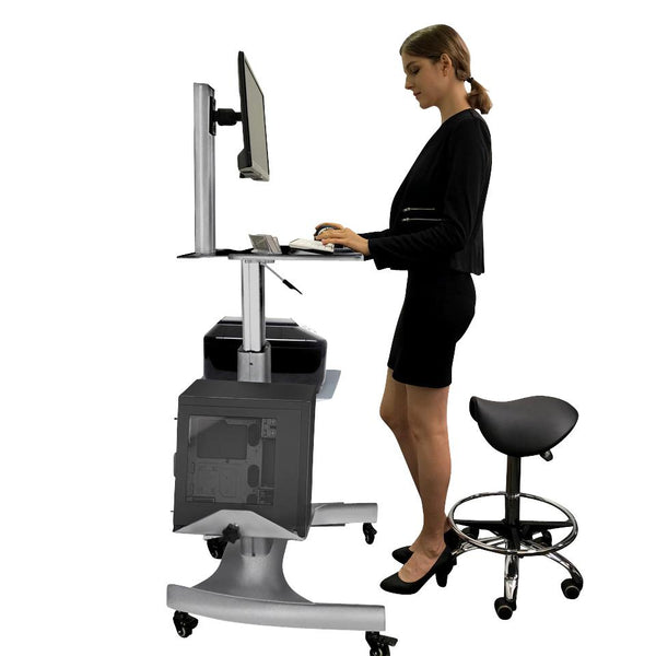 Featuring a wheeled design, this sit  stand computer cart is the ideal mobile desktop workstation. CPU, accessory, and keyboard shelves allow a variety of electronics to be placed on the unit with room to spare .Each heavy duty cart is crafted from aluminum and steel for a durable product that will last for years to come. Integrated cable management and power strip options  with 4 outlets helps to keep your desktop wires organized.The adjustable height column allow this mobile unit to be ergonomically correct for increased posture and health benefitsUseful in stores, libraries, and office settings, a cart with diversity in the design are sure to meet a variety of needs.
