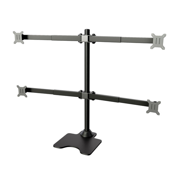 This is the ultimate free standing four monitors stand. This will hold most monitors 30" to 38" LCD monitors. Securely holds four LCD monitors above the desktop to increase work space, improve visibility and minimize clutter. Optimize ergonomics and monitor views with separate tilt, rotate, side-to-side, height and tension adjustments.