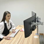 This Dual LCD Monitor stand is an Ergonomic Workstation Accessory that helps to maximize the desk space and reduce back pain and neck pain. The Dual Monitor Stand is a family of elegant LCD VESA desk mounts for 13"-27" monitors. It can support two monitors in a horizontal line and the weight capability for each one is 8 kgs /17.6 Ibs. It can rotate for 360°, which allows portrait and landscape viewing. Pivots & mounts provide mounting and dismounting. Fully Adjustable Arms Double monitor stand arms can tilt up or down 15 degrees and/or swivel 360 degrees left and right, and both monitors can rotate 180 degrees in either direction for landscape or portrait orientation - without removing them. The height can be adjusted on the middle pole.
