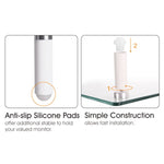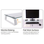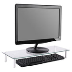 Universal Tabletop Monitor Riser. Raise your display to a comfortable and optimal viewing height with this contemporary stand made of premium glass, aluminum, and plastic. Raising your monitor to a proper ergonomic viewing position creates better posture which can help reduce neck and back strain computer users get from sitting at a desk for long hours.