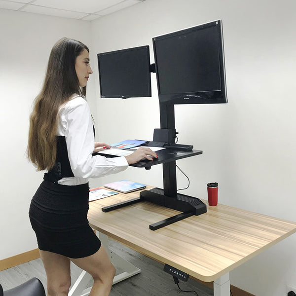 • ADJUSTABLE HEIGHT- Sit to stand in seconds with this electric sit-stand desk converter. The powerful electric motor makes the transition from sitting to standing as easy as can be, with no time wasted. You can improve posture and relieve muscle cramping or discomfort without taking you away from important tasks or projects.
