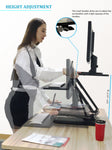 Sit to Stand Desktop Riser makes any standard desk or table a standing desk. The gas lift easily lowers and raises the main work surface from 5.9”-17.7” with a lever located under the desktop. By standing during your workday, you can alleviate stiff back pain, and improve circulation. The large 23.6” wide keyboard shelf is optional if using a laptop.