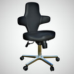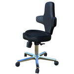 Stool on star base with wheels and seating comfort and ideal for high chair applications like for sit-stand desk, dentist or doctor, or industrial. This includes a height and angle adjustable back support.